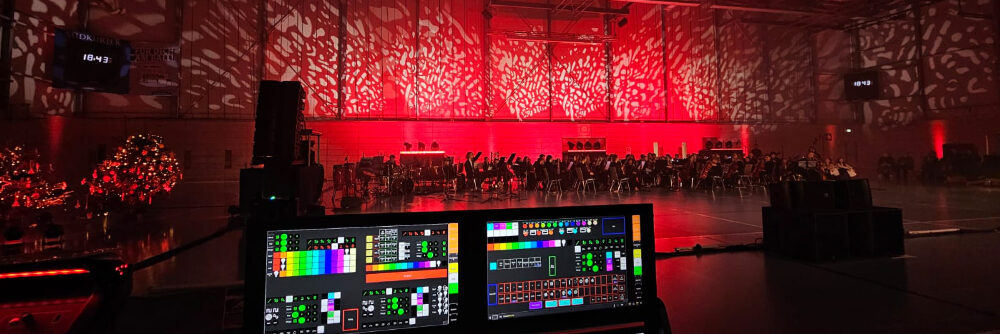 Aus diesem Grund wurde die komplette Ton-, Licht- und Bühnentechnik bereits am Vorabend installiert und auf rollenden Podesten vormontiert. Dieses Vorgehen ermöglichte es, die Technik nach Ende des Schulbetriebs innerhalb kürzester Zeit positionsgenau in der Halle zu platzieren und betriebsbereit herzustellen. So konnte ein reibungsloser Übergang zwischen Schulbetrieb, Proben und Abendveranstaltung gewährleistet werden.